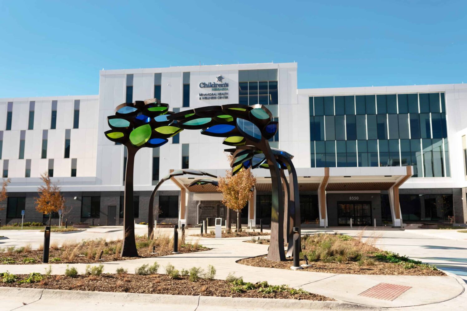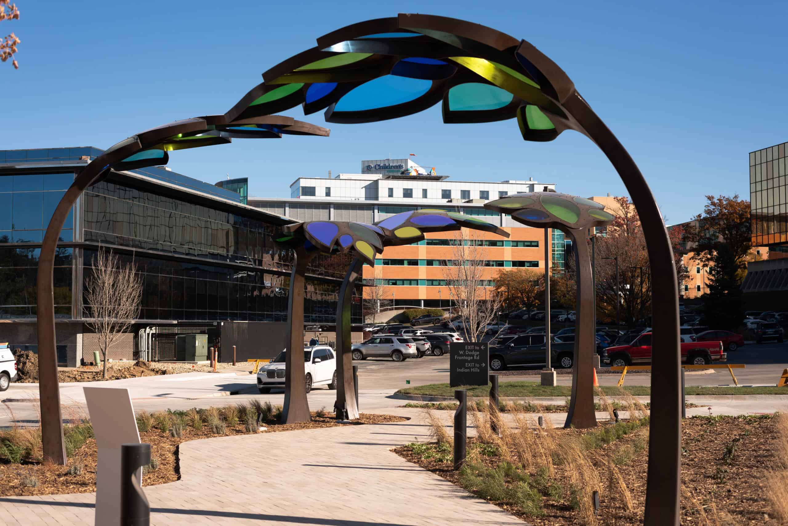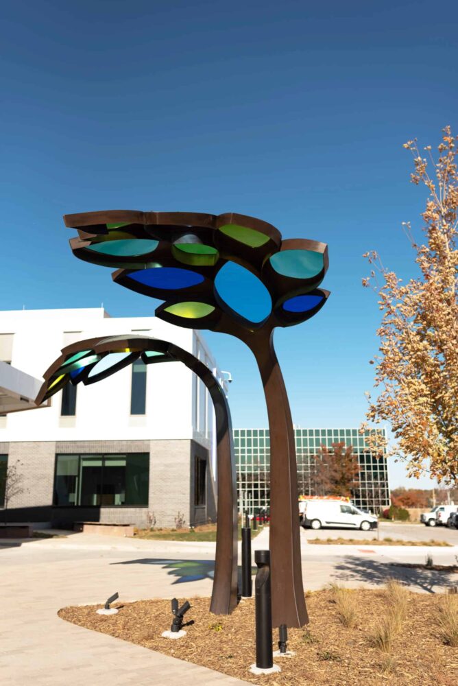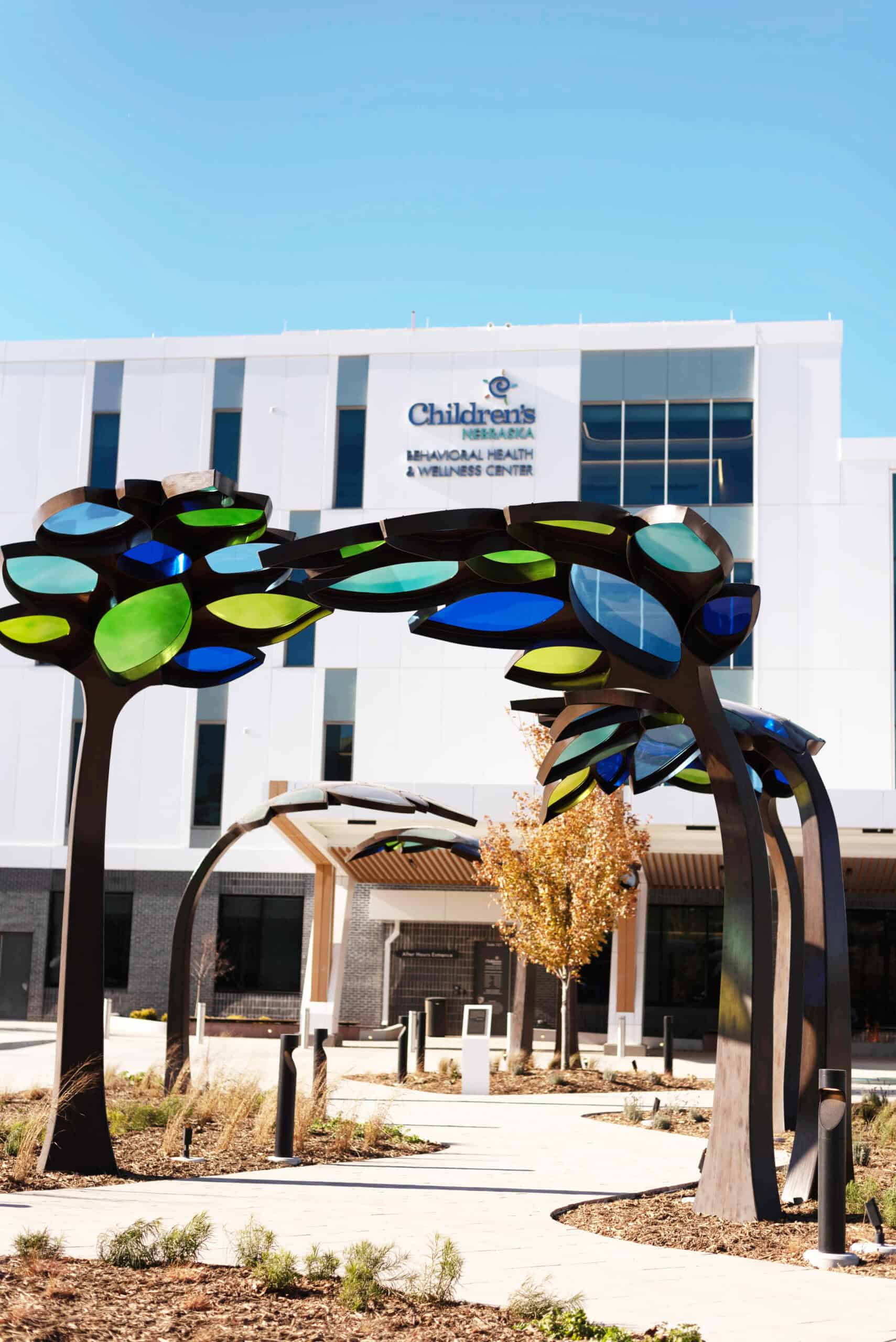 Children’s Behavioral Health Leaf Canopies Location: Children’s Behavioral Health and Wellness Center – Omaha, Nebraska Size: 14 feet-tall by 100 feet long Materials: Stainless Steel and Acrylic Date: 2025