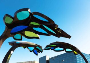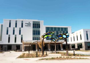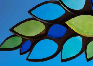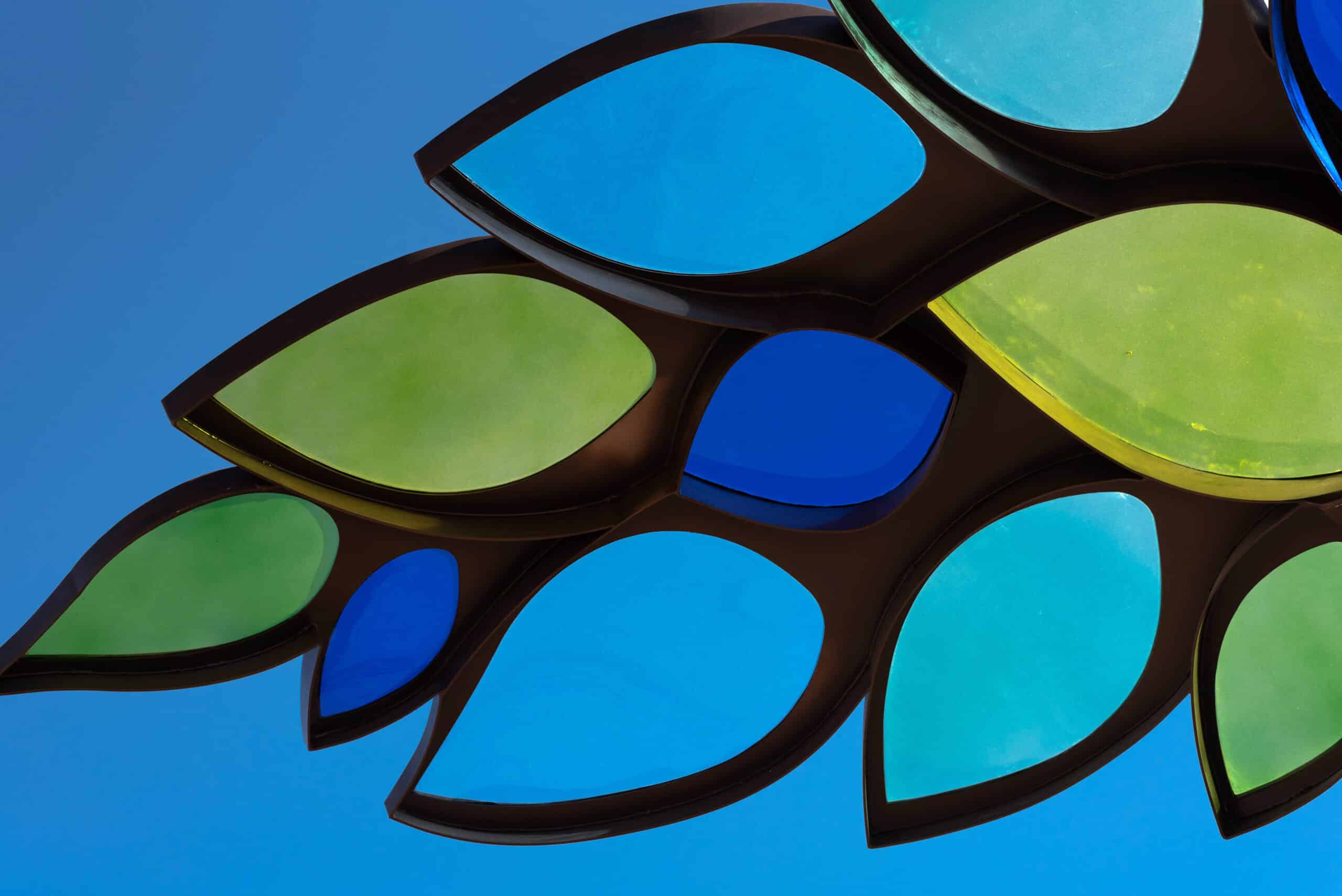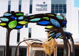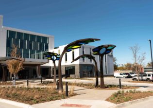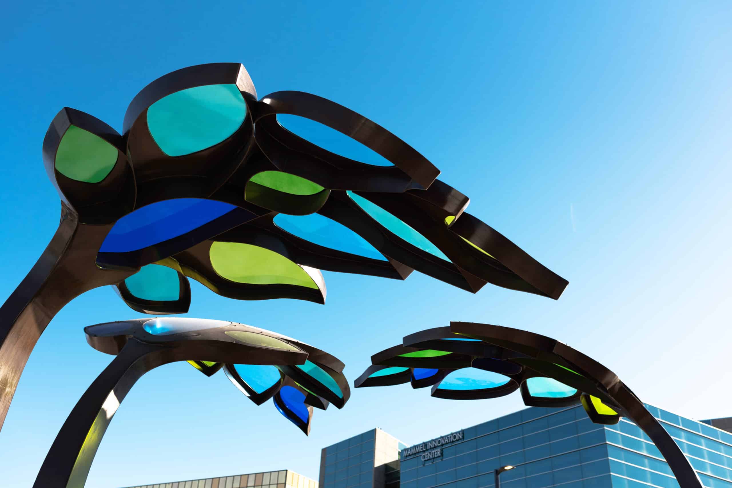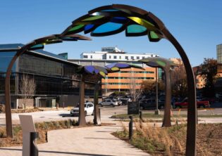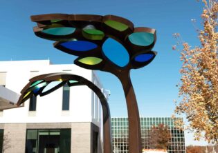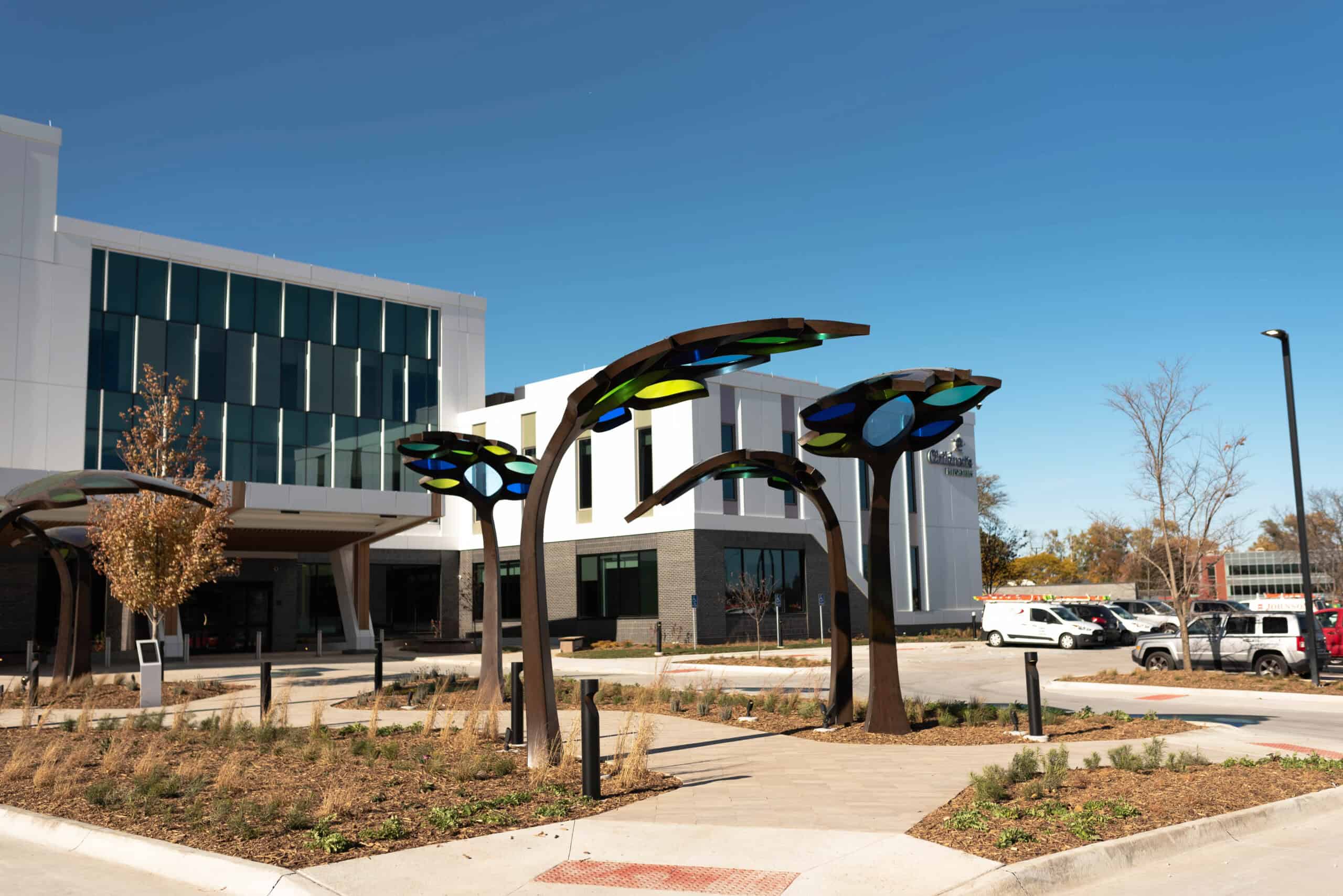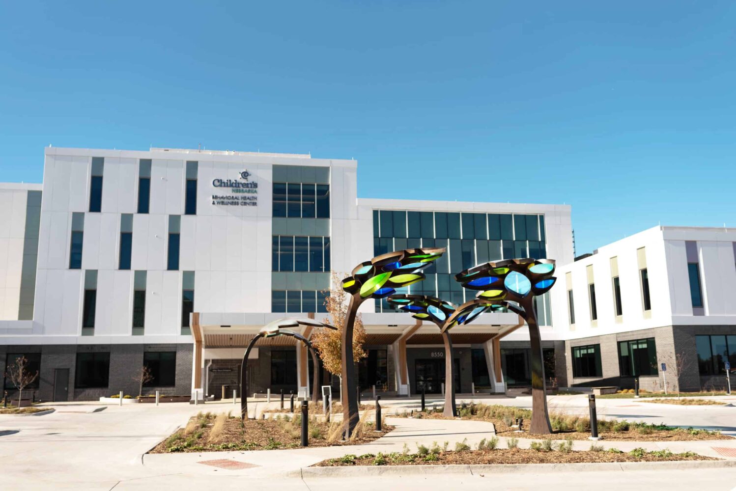 Children’s Behavioral Health Leaf Canopies Location: Children’s Behavioral Health and Wellness Center – Omaha, Nebraska Size: 14 feet-tall by 100 feet long Materials: Stainless Steel and Acrylic Date: 2025