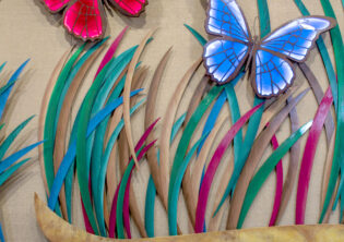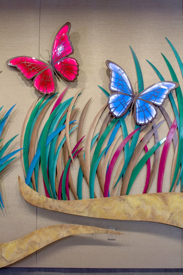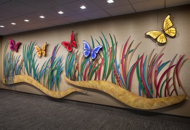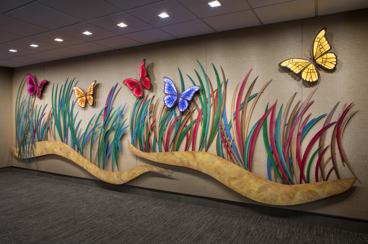 The colors of the heartland Great Plains is the inspiration behind this wall sculpture featured in the new Fred and Pamela Buffett Cancer Center, in Omaha, Nebraska. Located in the lobby of the center, this 28-foot sculpture is featured on the main level. “Colors of the Prairie”, a painted metal Grassland and Butterfly Sculpture, includes five LED back lit, stainless steel and acrylic butterflies, and features aluminum blades of native grasses that represent the changing seasons.