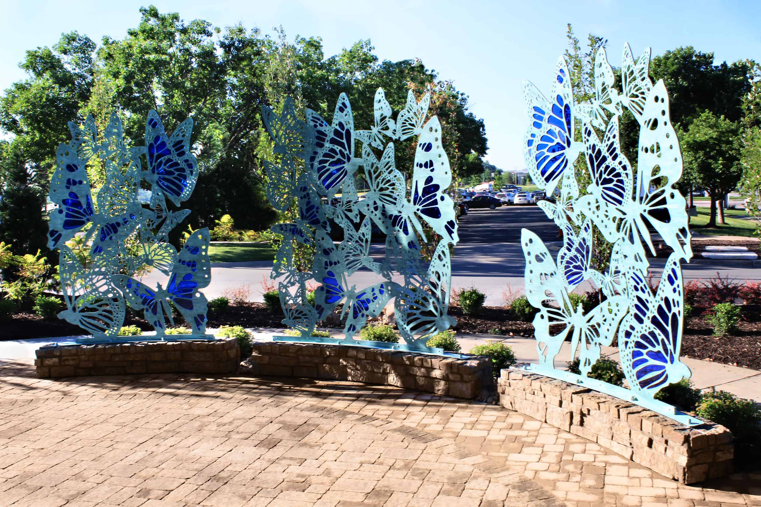 “Harmony Screen” is a symphony of three green-patina sculptures symbolizing hope, renewal and rejuvenation. The butterflies are highlighted with acrylic panels, which glisten in the sunlight.