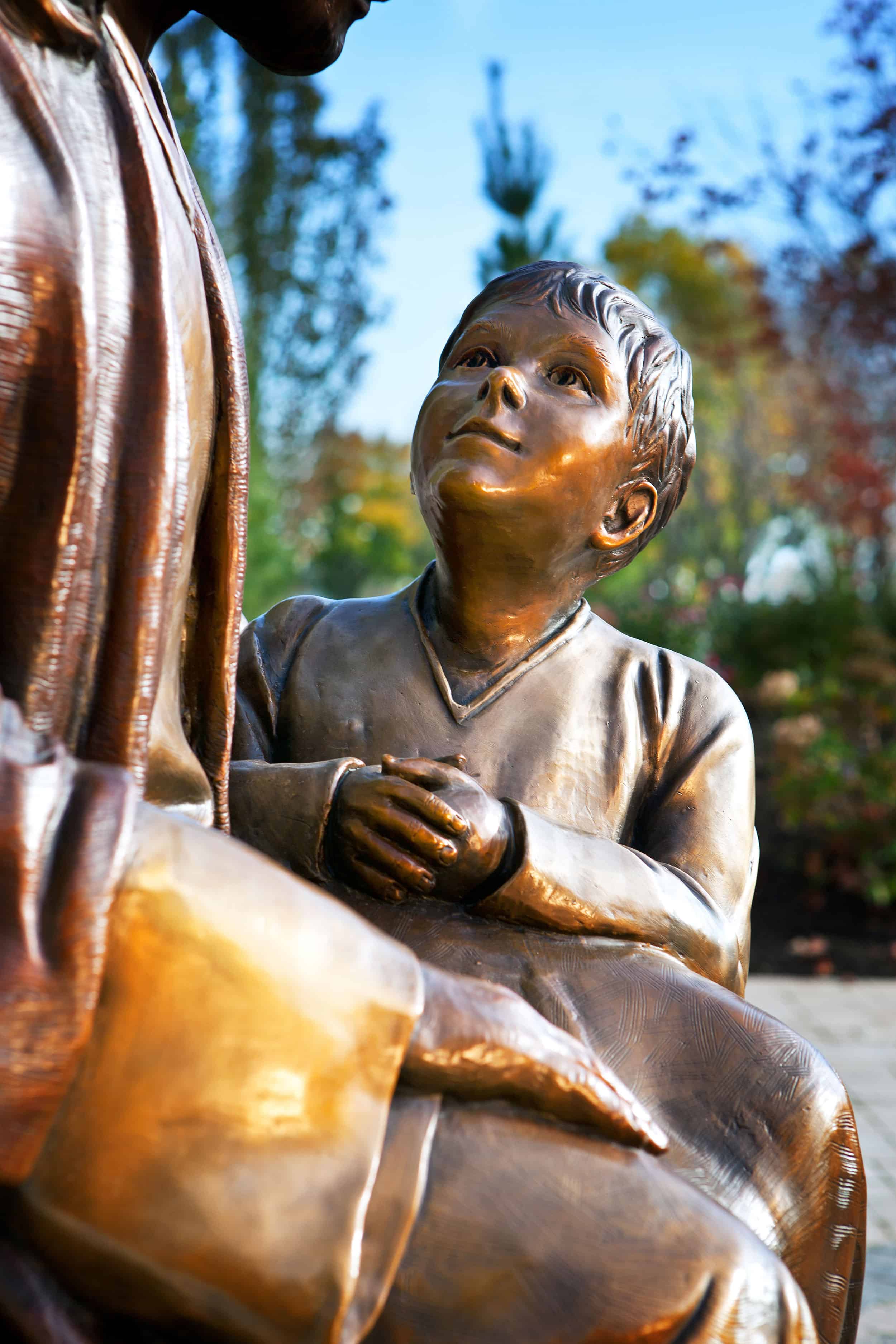 This life-size bronze sculpture depicts Christ seated beside a pair of doves as a boy looks at his elder in wonder. The warm patina finish is inviting in this inspirational healing garden, creating a serene place for reflection and healing.