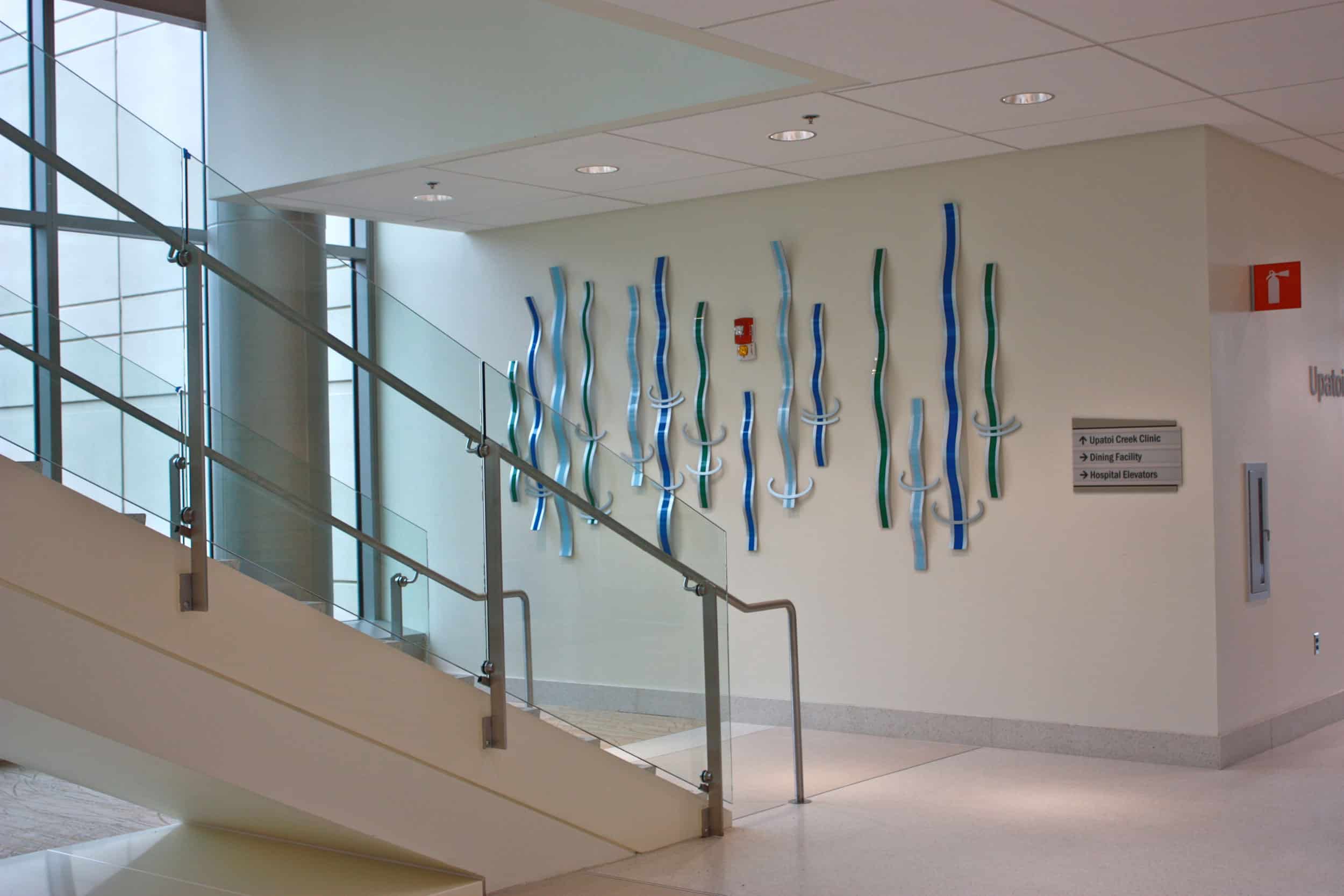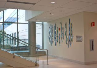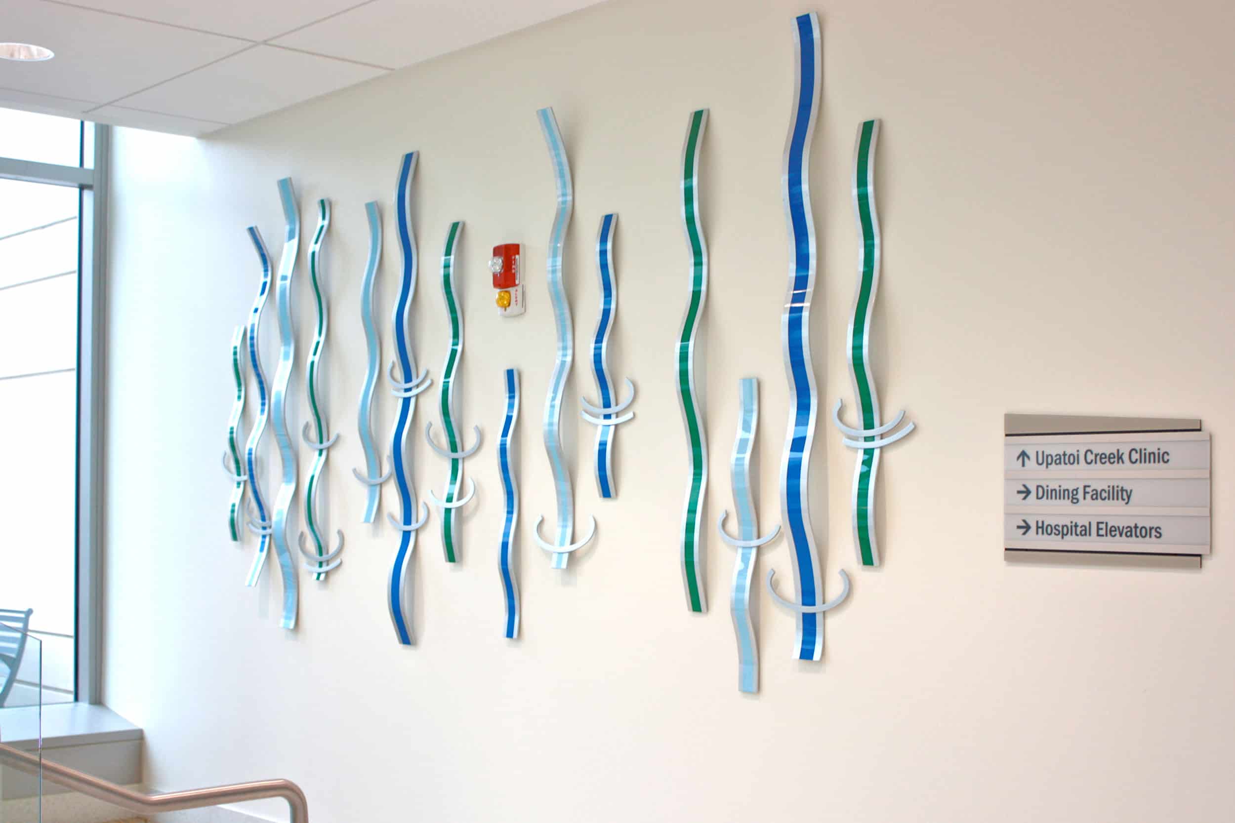 Linear lines and elegant curves of painted aluminum create the soothing wall sculpture “Reflections”.