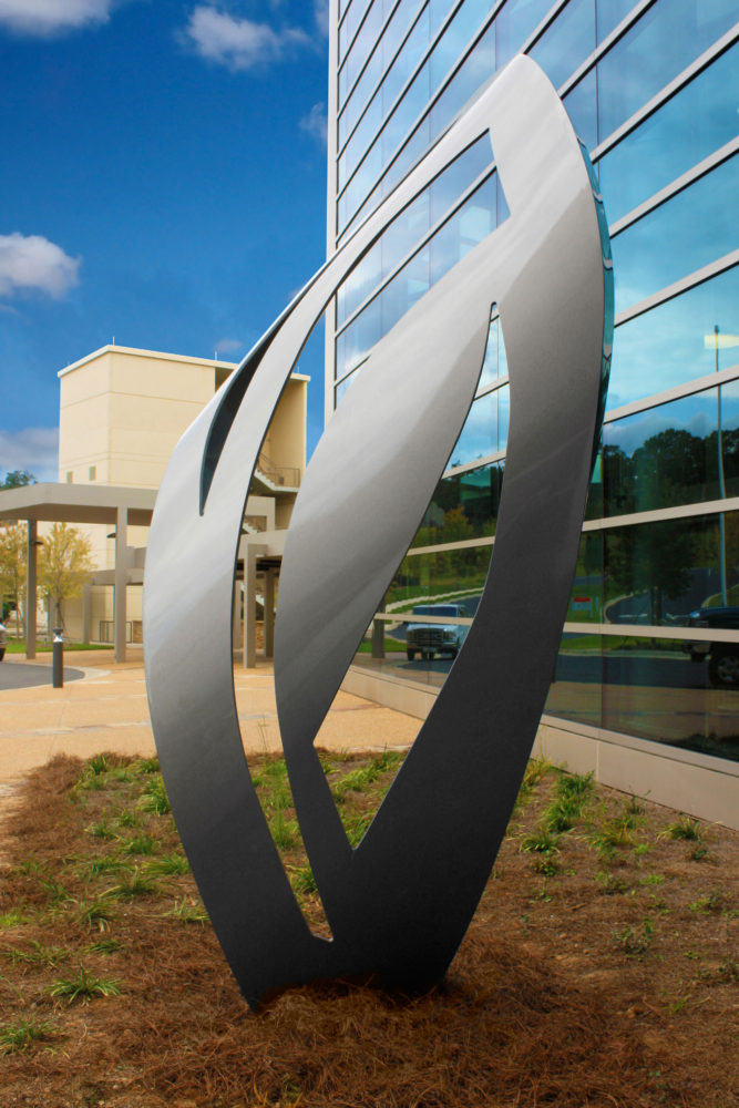The asymmetrical balance of “Serene” is created using a symphony of natural shapes and curves. Bold blue accentuates the sweeping arches, drawing your eye across the landscape of large-scale stainless steel forms. Nestling comfortably within the large outdoor entry space of Martin Army Community Hospital, the shapes of “Serene” arch up to 24 feet in length.