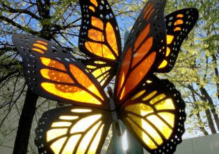 The acrylic panels of this 14-foot-tall butterfly sculpture shimmer and reflect the warm sunshine. This acrylic butterfly sculpture welcomes visitors to Borsheims Jewelry Company at the Regency Court Shopping Center — Omaha, Nebraska.