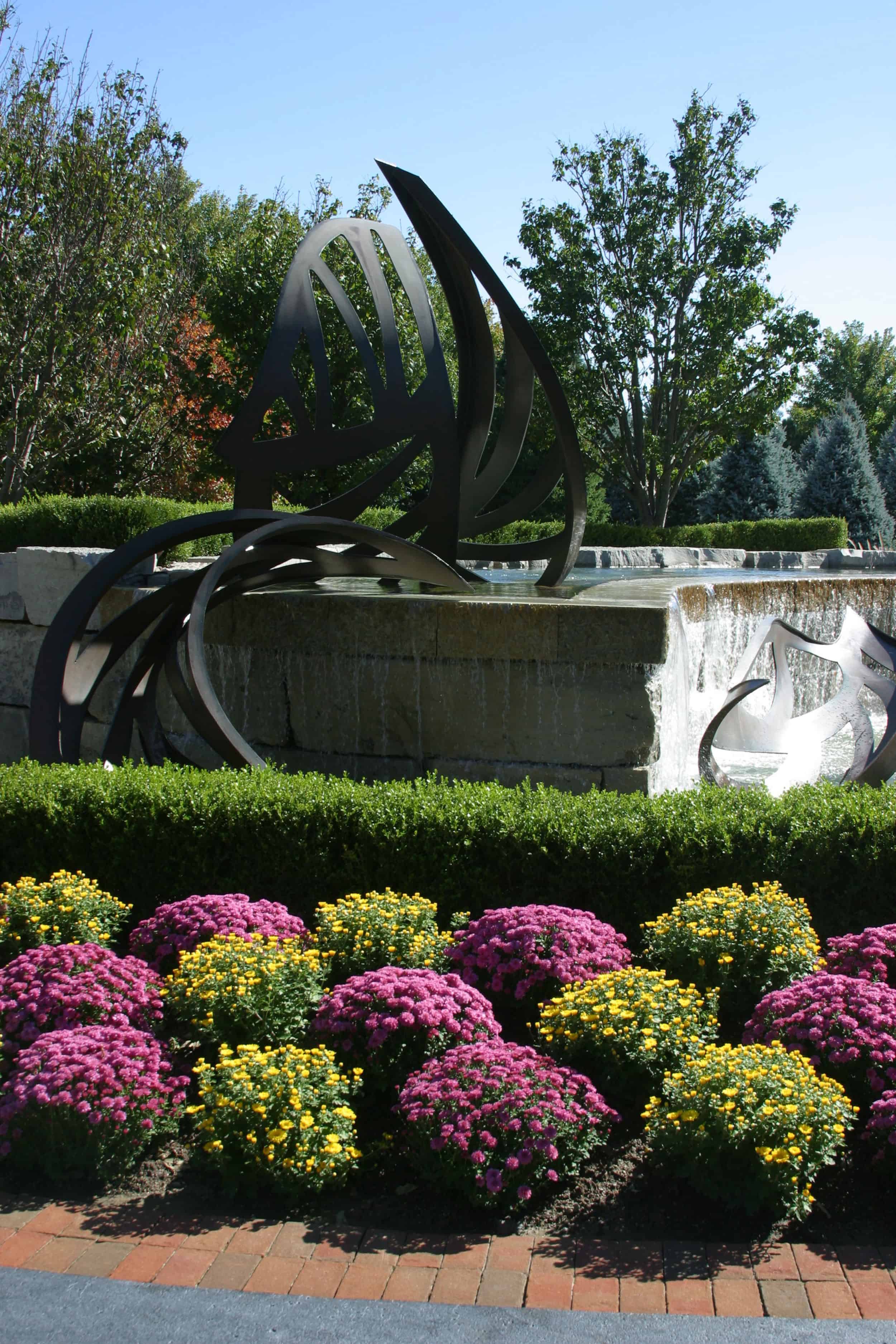 The movement and sophistication of the water feature “Leaves” creates an environment that arouses the senses. The 50-foot-long sculpture was created to allow water to flow in and among the aluminum – colored shapes.